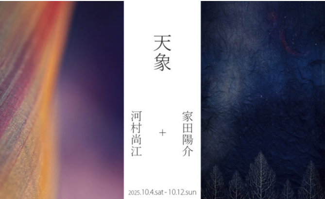 2025年10月4日㈯〜10月12日(日) 10:00〜17:00(最終日は16:00閉場) Galerie  numéro 9  太陽や月、星々の運行。雲や雨、虹や雷。天象とは、私たちが空を見上げるたびに出会う、壮大で神秘的な現象を意味します。 古来より人は天を仰ぎ、そこに時の移ろいや生命の循環を読み取ってきました。 染色と和紙―異なる素材を用いながらも、自然の力と響き合う二人の作品は、 空に広がる天象のように、見る者の心に果てしない広がりをもたらします。 是非ご高覧いただきますよう、よろしくお願い申し上げます。  Galerie numéro 9 〈ギャラリー ヌメロ9〉 岐阜市菅生8-2-10 UMEDA BLDG 2F 070-8968-4383  アクセス;JR岐阜駅から10分、岐阜西駅より車で5分